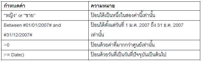 - Validation Rule ใช้กำหนดเงื่อนไขสาหรับค่าของข้อมูล เช่น ใน field นี้จะต้องป้อนข้อมูลเพียง 2 ค่า คือ หญิง หรือ ชาย เท่านั้น ถ้าป้อนนอกเหนือจากนี้แล้ว จะแสดงกรอบหน้าต่างเตือน และไม่สามารถป้อนนอกเหนือจากที่กาหนดไว้ได้ เช่น